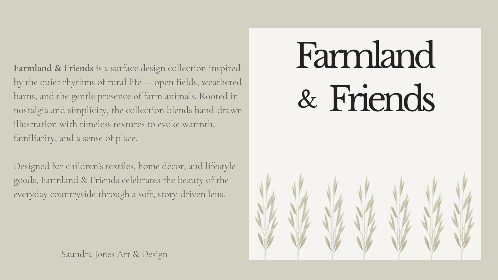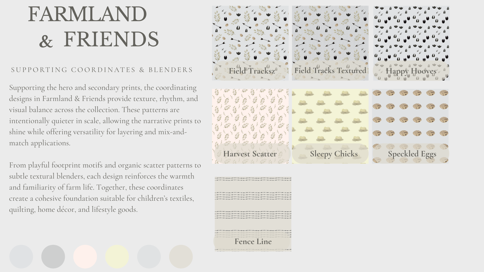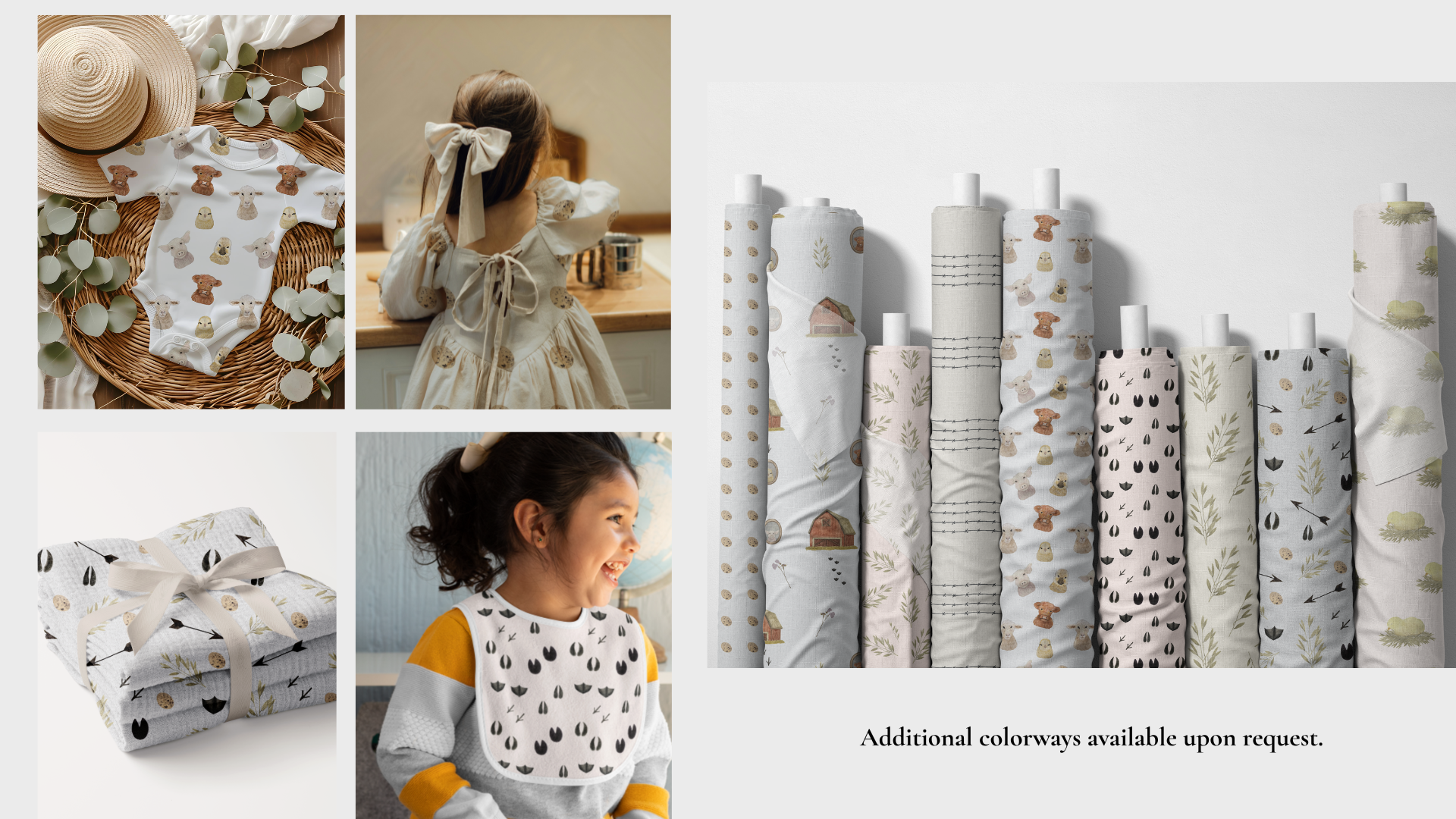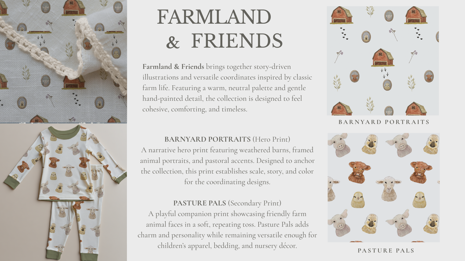 Farmland & Friends is a surface design collection inspired by the quiet rhythms of rural life. Featuring story-driven illustrations, versatile coordinates, and soft, neutral colorways, the collection is designed for children’s textiles, home décor, and lifestyle goods. Additional colorways available upon request.